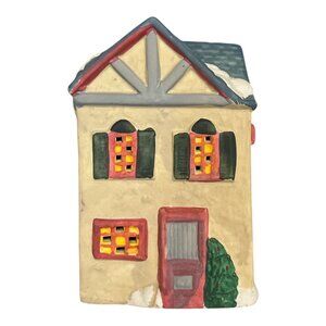 Made of ceramic with window cutouts for use with a string light or bulb (not included). The original gold foil "Made in Taiwan" label remains on the base. Please note the chimney is missing but the building is otherwise intact.