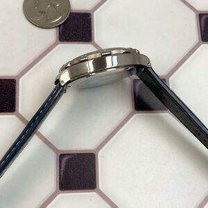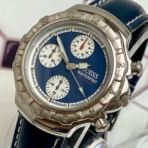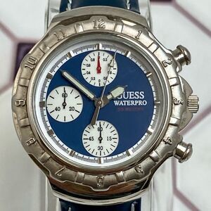 Vintage GUESS Waterpro chronograph men's / unisex watch. Watch is somewhat small for a man's by today's standards. Please ensure case size works for you before purchasing. Watch features a silver-tone case with fixed bezel. The blue dial has sub-dials for .2 seconds, seconds and minutes elapsed and is marked, "GUESS Water pro." The screw-down case back has the GUESS logo and is marked, "Guess Waterpro, 50 Meters Water Resistant, Stainless Steel Back, GUESS?, Inc. 1995, Japan Mov't." The case measures approx. 37.5mm across excluding crown and pushers, and watch with blue leather strap measures approx. 9 1/4" (max wrist size of approx. 7 1/2). Watch is in good condition with a scratch-free crystal, and light scuffs / scratches to the case and caseback. The leather strap is new and not original to the watch (similar to the original). Watch has a new battery, keeping time and chronograph is working as it should. Comes with original case and instructions. Thanks for checking out my closet!