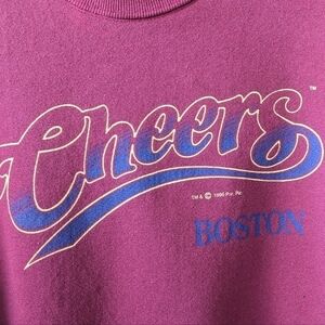 Vintage 1996 burgundy red crew neck sweatshirt from Cheers. Official Cheers Boston sweatshirt; purchased in Boston, Massachusetts in late 1990s. Long sleeve. Wash wear throughout and small, speckled light stains on lower front (shown in closeup in 2nd to last picture). Unisex.