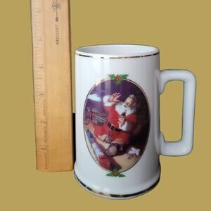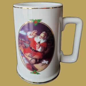 Large white ceramic mug with gold trims and an image from 1932 from Swedish born artist Haddon Sundblom who's artwork for The Coca Cola company changed the appearance of Santa Claus for the future. This 4.5" tall mug is great for hot toddy's or cocoa, what ever St. Nick prefers when he visits on Christmas Eve.