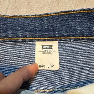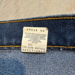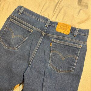 The product is a pair of vintage 1996 Levi's 517 Orange Tab whiskered flared boot cut denim jeans in size 40x32. These medium wash jeans feature a regular fit and are made of cotton denim. They are machine washable and have pockets, showcasing the classic Levi's style. With a blue color and the iconic Orange Tab branding, these Levi's 517 jeans are a timeless piece of men's clothing from the Levi's 500 Series, manufactured in the United States.