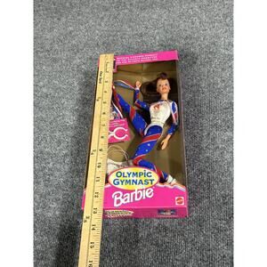 This Olympic Gymnast Barbie is an officially licensed product from the Atlanta Committee for the 1996 Olympic Games. Features Barbie in a patriotic red, white, and blue gymnastics outfit emblazoned with the Atlanta 1996 Olympic logo and stars. Comes with accessories including a gym bag, ribbons, and a gold medal.