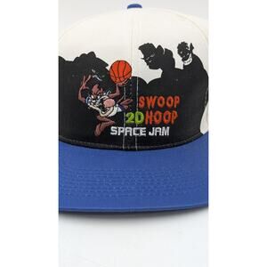 Step back into the 90s with this original 1996 Space Jam snapback hat featuring Taz (Tasmanian Devil) going head-to-head with the Monstars. The front panel reads "Swoop 2D Hoop" and "Space Jam" in colorful embroidery. This collectible cap is made from 100% cotton, features a blue bill and button, and is officially licensed by Warner Bros. Still has its original retail tag attached.