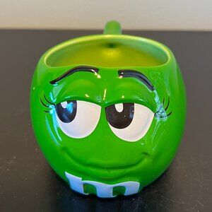 Indulge in nostalgia and eat your heart out for this highly collectable, vintage ceramic mug featuring a 3-Dimensional green faced M&M character with large, wide open eyes, long black eyelashes, raised black eyebrows, a sweet smile, and a white embossed letter M. Rounded shape and bright green glaze. Measures 4”tall with a 3”diameter; 6.5” lacrosse including the handle. Holds 16 fluid oz. Large easy-to-grip handle. Incised maker's mark on underside reads, © Mars 1997. Made in Thailand