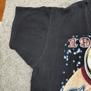 Super soft vintage worn in faded tee, lots of life left. Graphics have some wear, loose thread from some pulled stitches on shoulder (SEE ALL PICS FOR CONDITION)
