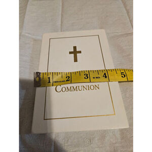 This is a pre-owned First Holy Communion picture frame made by Roman, Inc, 1997. It is made of white wood with gold accents. The frame is 5 inches wide and 7 inches tall. It has a hinged design that opens to reveal a space for a photo and a small cross with a chalice. The frame also has a space for a personalized inscription. The frame is in good condition with minor signs of wear.
