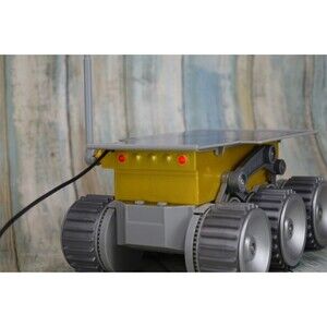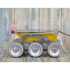 This awesome collectible features a six-wheel design, a prominent solar panel, and a wired remote control. It's a fantastic display piece for any NASA enthusiast, space exploration fan, or collector of vintage toys.