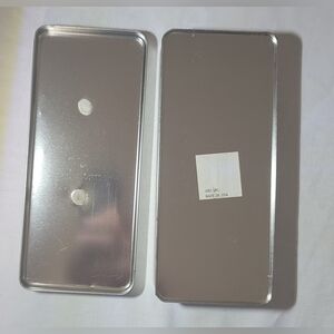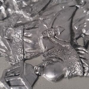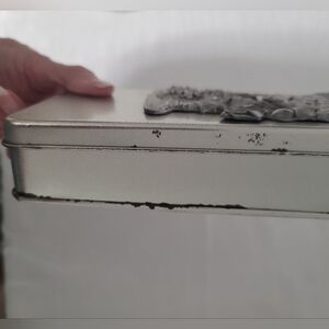 Charming silver tin box with pewter Santa on the lid. Ideal for gifts or storage. The close-up pic shows the date and mark, also sticker on the bottom with GBD INC Made in USA. See pics for condition; there is some aging.