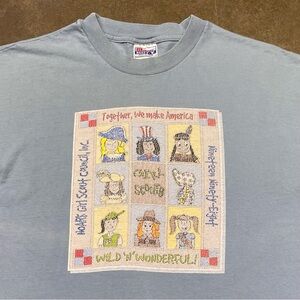 Vintage 1998 Girl Scout Council Inc. t-shirt featuring colorful embroidery-style front graphic with “Together, We Make America” theme. Soft sky blue cotton, made in Mexico, Hanes Beefy-T tag, size XL (46–48). Celebrates Girl Scouting and diversity with fun, hand-drawn characters. Preowned, good condition, no holes - minor fading. Smoke free home. Measurements in the photos. Please note that clothing colors may appear different on screens. Packed and ready for fast shipment. Message me with any questions!
