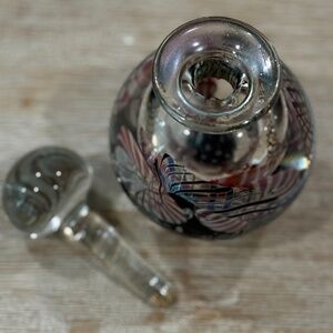 Part of the Paperweight Collection by Henry Summa~I purchased this perfume bottle in Santa Fe, New Mexico on a road trip in '98. As example from an important and well respected New Mexico artist. The modern design features a twisted metallic striped twisted coil with maroon trumpet flowers.