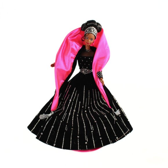 Celebrate the magic of the holidays with the Vintage 1998 Holiday Barbie "Christie" Doll! This stunning doll features a beautiful black and silver ball gown with mesh sleeves and a hot pink sateen shawl wrap, embodying the elegance and glamour of the season. Her updo hairstyle adds a touch of festive sophistication, though it does have some glue residue from age, which is visible in the images.