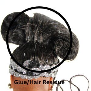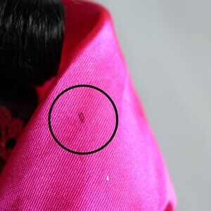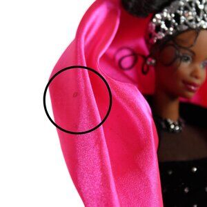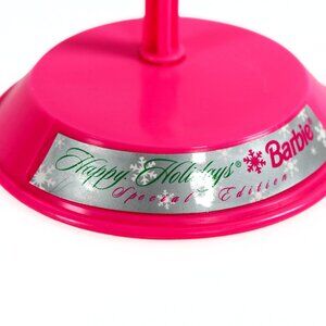 The doll comes with the original hot pink Holiday Barbie stand, which perfectly complements her festive outfit. While the gown is elegant, there are some loose threads and stains on the dress, along with signs of wear from age, use, and display, including marks, stains, and scratches. Despite these imperfections, this doll remains a fantastic piece for any Barbie collector or Holiday Barbie fan, especially for those who appreciate the beauty of 90s vintage dolls.