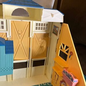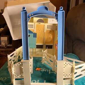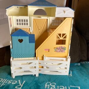 This is a vintage Mattel Barbie play set from 1998. This play set is the Barbie horse stable and includes most of the pieces. There are a few small pieces missing like 2 of the horse troughs. This playset is in good used condition with the stickers still intact. The playset includes all pieces that are shown in the photographs. This includes the paper ribbons as well as the carrots.