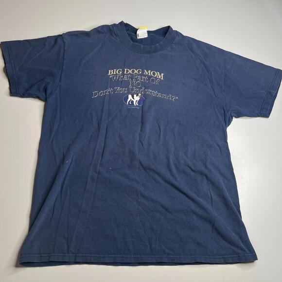 Vintage 1999 Big Dogs graphic T-shirt in navy blue. Features the funny slogan “BIG DOG MOM – What Part of NO Don’t You Understand?” with a bold dog graphic. Size Large, made in Mexico from 100% cotton. Classic 90s Y2K Big Dogs streetwear, popular for its oversized fit and humorous prints. Great for collectors of vintage Big Dogs apparel, dog lovers, or retro 1990s casual wear.