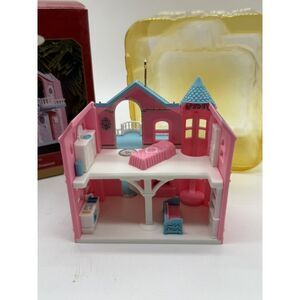 Features: Miniature Barbie Dream House with detailed Victorian architecture, open back to reveal furnished interior, balcony, and porch