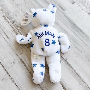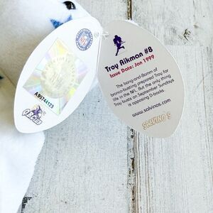 Vintage 1999 Salvinos Bammers collectible plush beanie bear representing Troy Aikman #8, quarterback of the Dallas Cowboys. Officially licensed NFL merchandise with original hang tag and tush tags intact.