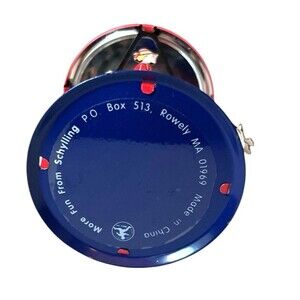 The Vintage 1999 Schylling Pull & Spin Classic Tin Carousel Toy features a charming design with a dog, pig, rabbit, and horse on a spinning carousel. Made of tin and standing at 3.75 inches tall, this reproduction toy captures the nostalgia of traditional carousel toys. With a diameter of 3 inches and weighing 3.1 ounces, this item is sure to delight children aged 8 and up, as well as collectors of vintage toys. Imported from China, this classic tin carousel toy is a lovely addition to any collection.
