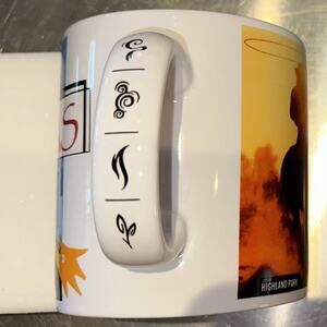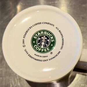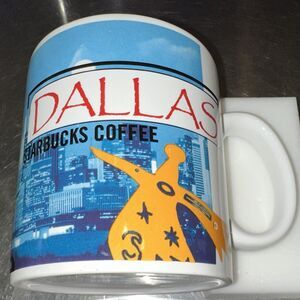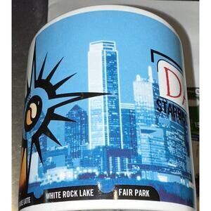 1999 Starbucks Dallas Texas Coffee Mug. Features scences from Dallas with Highland Park, Big "D", Grande Latte, White Rock Lake, etc. written on bottom. Mug is in EXCELLENT condition. Measures 4.25" H x 3.75" W (rim to rim). Holds 20 fl oz of your favorite beverage.