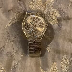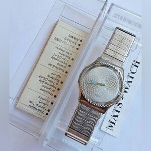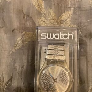Sleek Swatch watch with a metallic silver finish. Modern and stylish design.