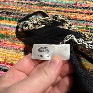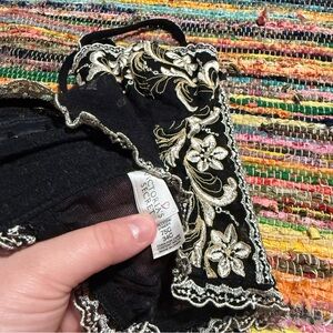 Stunning Y2K-era Victoria’s Secret bustier from 1999 in a sultry sheer black mesh with ornate gold and silver floral embroidery. Features underwire cups for support, adjustable straps, and gorgeous scalloped edging. Tagged size 34C. A rare collector’s piece that’s both elegant and seductive—perfect for lingerie lovers, vintage collectors, or styling as a bold top.