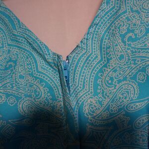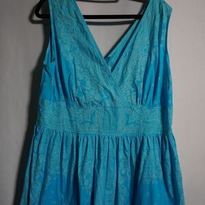 Vintage 1X Cotton Blue Plate Paisley Dress Knee Length V Neck Open Back Y2K VTG 90s Spring Summer Mini Sleeveless Babydoll short tea party wedding guest casual bright stunning beautiful cream detail zip 100% cotton bohemian plus size wedding guest casual