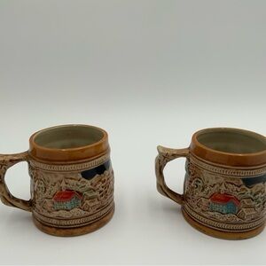 Vintage 2 SANYO CMC JAPAN CUPS Ceramic German Style Stein Beer Cups. No chips or cracks. Beautiful detail, vibrant colors, great condition.