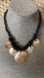 Vintage 2 Strand Artisan Mother of Pearl Cabochons & Glass Beads Necklace 19” inches This captivating necklace showcases a harmonious blend of luminous mother of Pearl shell cabochon and black glass beads. The central circular shell piece, flanked by smaller discs, creates a striking focal point with its pearlescent tones.