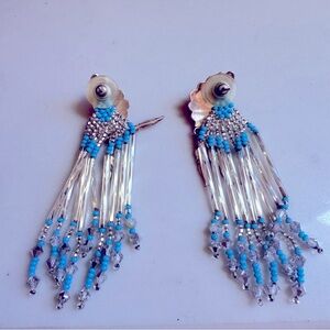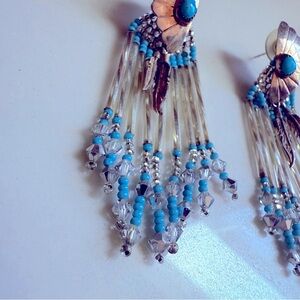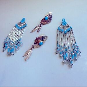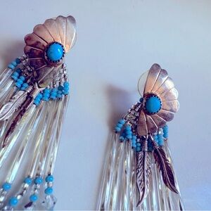 Vintage 2 in 1 Elegant Turquoise Flower/Feather Silver Dangle Earrings