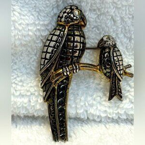 Two Sisters Silvertoned pewter Parrots on Branch Brooch Pin.