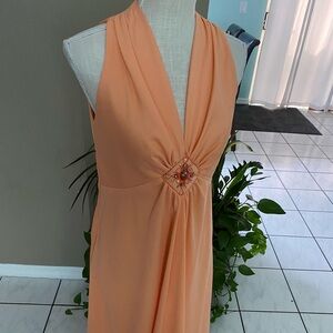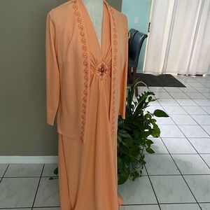 Nearly perfect! Vintage JC Penney circa 1970's. Peach colored stretch polyester with sequins/embroidery. Vintage size 16.5 converts to modern size 10 (mannequin is a size 6 for reference). 2 very faint specks shown in last pic are the only flaw, have not tried to clean. No funky odors. **Dress has been altered and can be reverse to gain about 2 inches** Dress measures 36 chest, 32 waist, 50 hips, 55 length from shoulder. Jacket measures 40 chest, 38 waist, 25 length, 21.5 sleeves.