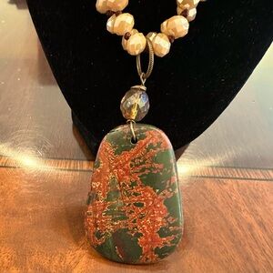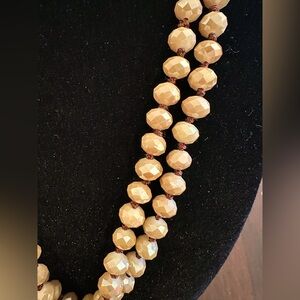 Vintage 20” Beige Glass Beaded Double Strand Necklace wBeautiful Jasper Pendant.