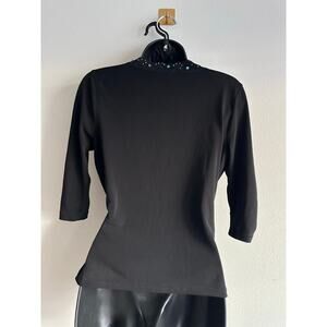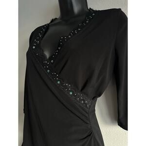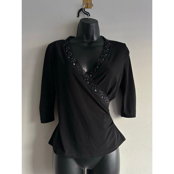 Vintage black wrap-style top with delicate lace trim and hand-applied beaded sequin detailing along the neckline. Soft drape with a flattering V-neck wrap front and fitted waist.