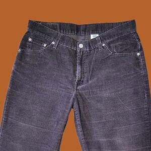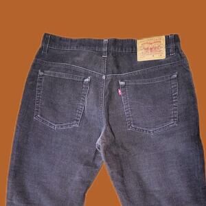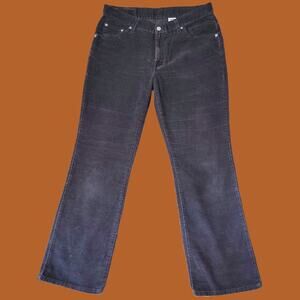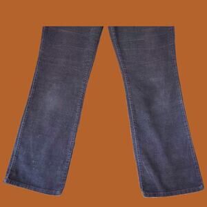 Black corduroy mid rise flared jeans with Levi's signature front pockets, belt loops, back pockets, and red tag with the "small e". The waist and hips on these jeans were designed for curvy women. Worn in but no damage or thin spots.