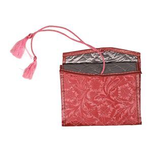 Vintage 2000s red medieval style drawstring pouch in satin with floral texture and tassel cords; measures approximately 5.75" W x 5.75" H — ideal for jewelry, gifts, or travel storage.