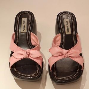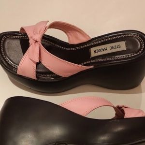 Cutest baby pink bow straps, and dark chocolate brown platform. Almost like new condition no real signs of wear other than faintly on the bow, zoom for deets. Size 9.5