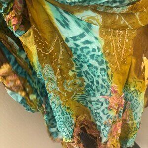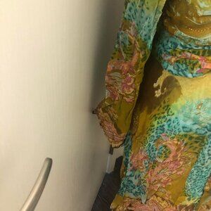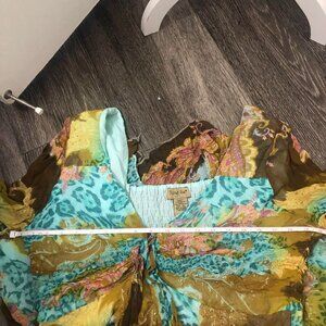 circa 00s. maximalist, Mixed Print top with beaded detailing. V neck/bias Cut style. Tunic length (not long enough to be a dress). label says size XL. pit to pit is approximately 19.5 inches, and can fit up to 39 inch bust. fits approximately a size M/L (size 10/12) modern.