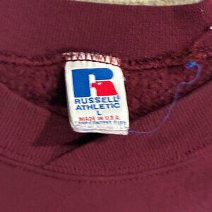 Vintage 2000s Burgundy Russell Athletic crewneck sweatshirt with stripes going down the arms