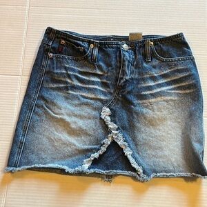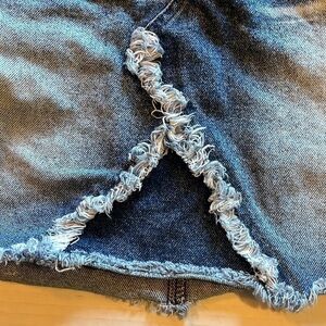 Vintage 2000’s-Mudd Yo!- size 5-Y2K denim miniskirt. Frayed details along middle and hem. three pockets in the front, two pockets in the back. button and zipper to close in front. 100% cotton. See photos for measurements.