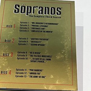 This is a 2001 boxed set for the HBO television series The Sopranos starring James Gandolfini. It’s the 3rd season and it’s a 4 disk set. All the disks have been tested.