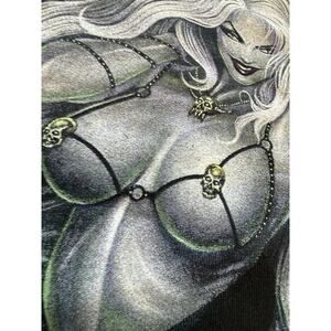🔥 Insane Y2K Chaos Comics Lady Death tee from 2001. Features Lady Death in a black skull-strapped outfit, flaunting the classic hyper-stylized aesthetic that made the comic infamous. This one’s brand new without tags — never worn, just stored for over two decades. Printed on an Anvil USA-made, Honduras-assembled tee. Faint demonic face hidden in the shadows and heavy metallic purple tones in the hair give this a sick horror/fantasy poster vibe.