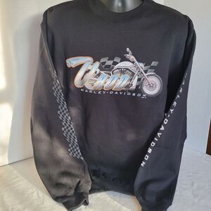 This listing is for a vintage 2001 Harley-Davidson V-Rod crewneck sweatshirt in Men’s size Large. The sweatshirt is new without tags and has never been worn. It features bold V-Rod graphics, Harley-Davidson lettering along the sleeve, and a checkered flag design on the other arm.