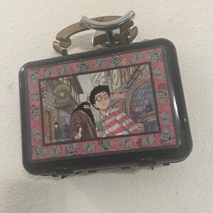 Step into the wizarding world with this vintage 2001 Harry Potter school box featuring Harry and Hagrid strolling through Diagon Alley