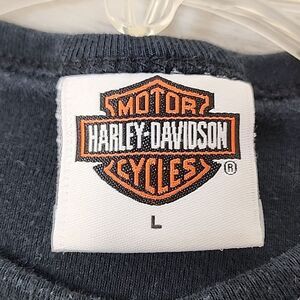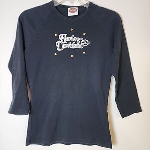 This vintage 2001/20022 Harley Davidson top for women is a stylish and edgy piece featuring a solid black color with gold accents, perfect for the biker at heart. Made of 100% cotton knit fabric, this slim-fit top has a round neckline and 3/4 raglan sleeves for a comfortable and casual look. The shirt is adorned with rhinestone accents and has a distinctive grunge and gothic vibe, ideal for those who appreciate classic and metal-inspired styles. The tee is perfect for travel or casual wear, adding a touch of USA and Daytona flair to any outfit.