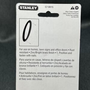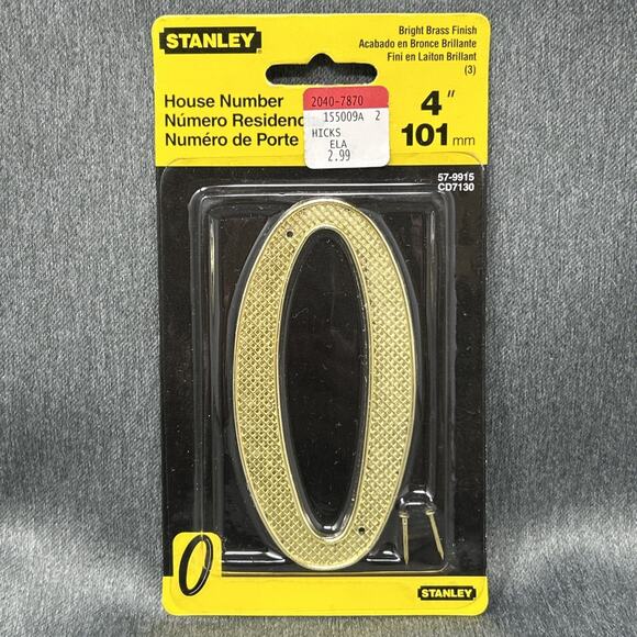 Vintage 2002 Stanley house number ZERO, 4" bright brass metal sign in original packaging, rust-resistant screws included, ideal for retro home restoration or NOS hardware collectors.