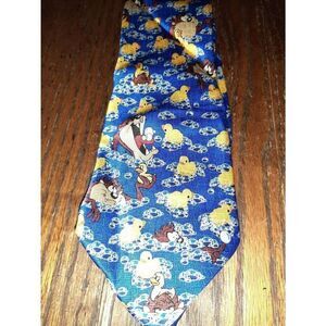 Good Vintage Condition Men's 2002 Warner Brothers Looney Tunes Taz with Rubber Duckie Blue, Yellow, White, Brown, and Tan 100% Silk Neck Tie