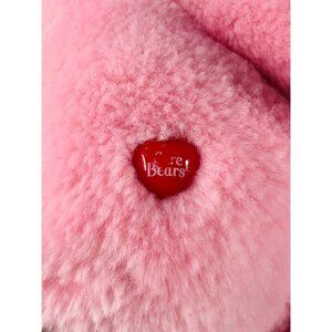 This Love-A-Lot Bear from 2003 is a collectible Care Bears plush, measuring 14 inches. It's crafted in soft pink fabric, featuring dual embroidered hearts on its belly, and holds a yellow star. Ideal for collectors or a thoughtful gift.