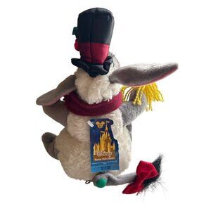 This unique Disney Eeyore plush toy from the 2003 Theme Park Edition doubles as a bean bag and rattle, dressed festively as a snowman. Enhance your collection with this endearing character, featuring intricate details such as a top hat and colorful scarf. In great condition.