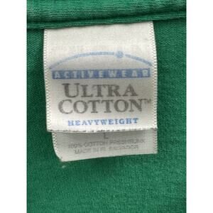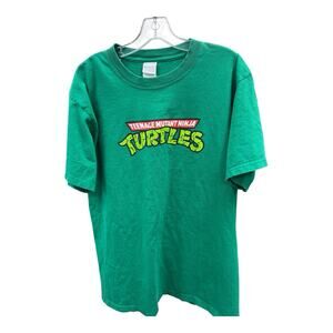 This vintage 2003 Mirage Studios Teenage Mutant Ninja Turtles T-shirt in size Large features a classic crew neck and short sleeves, making it suitable for all seasons. The green shirt is made of cotton knit fabric with a medium wash, showcasing the iconic 1980s graphic of the Teenage Mutant Ninja Turtles logo. This retro tee is a nostalgic piece that appeals to fans of the cartoon series and 80s memorabilia, perfect for casual wear with a touch of nostalgia.
