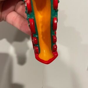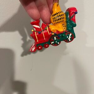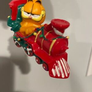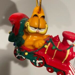 Colorful Garfield train ornament. Features vibrant red, green, and yellow hues.