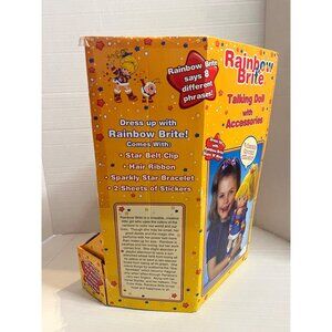 This delightful vintage Rainbow Brite Talking Doll comes with interactive features, including eight unique phrases. The set includes accessories like a star belt clip, hair ribbon, sparkly star bracelet, and sticker sheets, encouraging imaginative play. Designed for children aged three and up, it's a colorful addition to any collection. collectible, vintage, doll